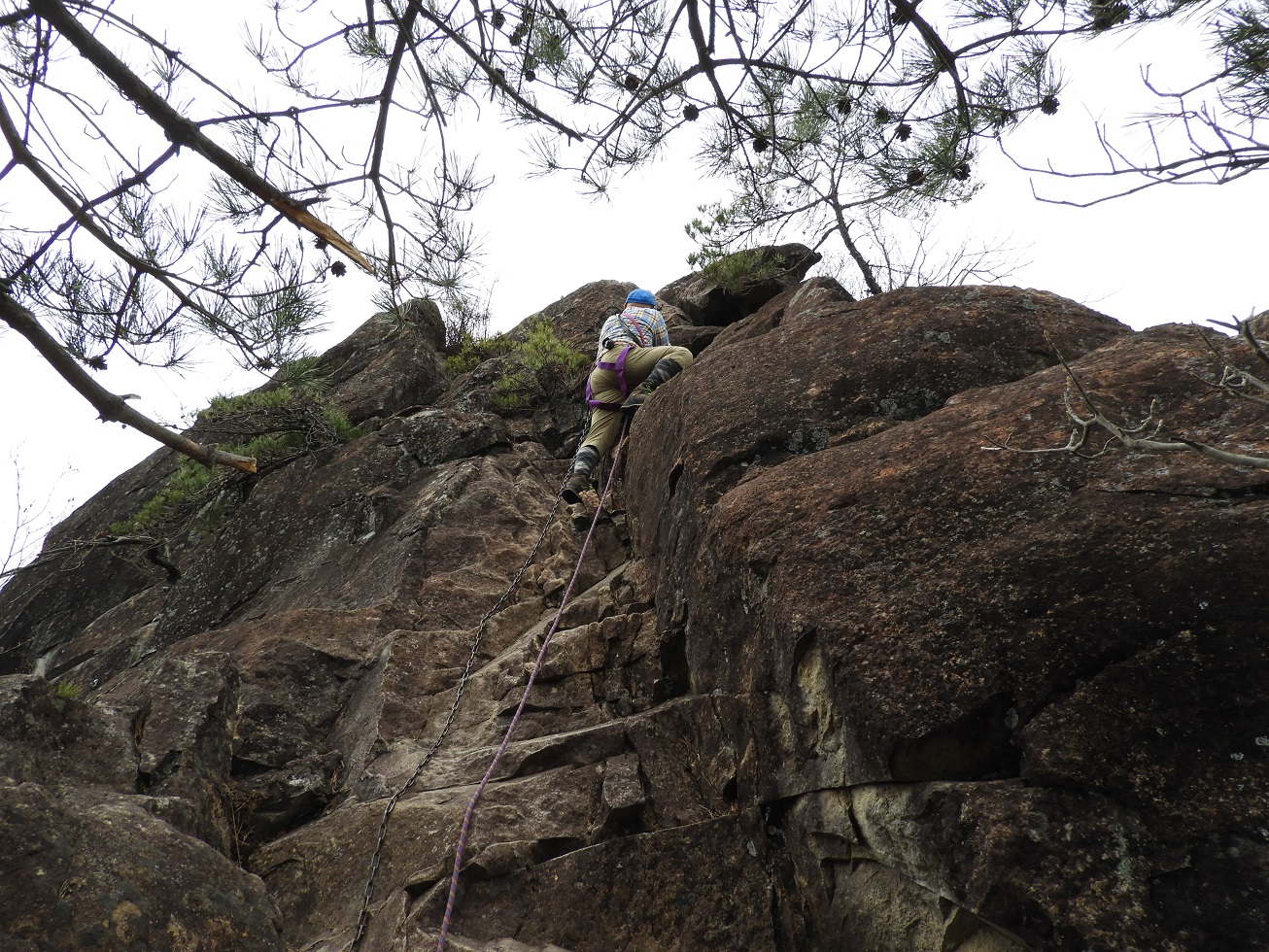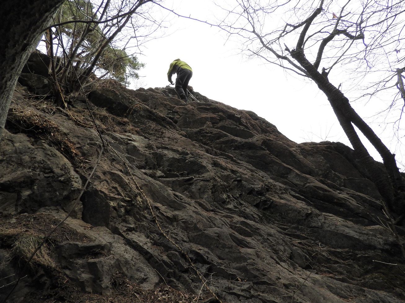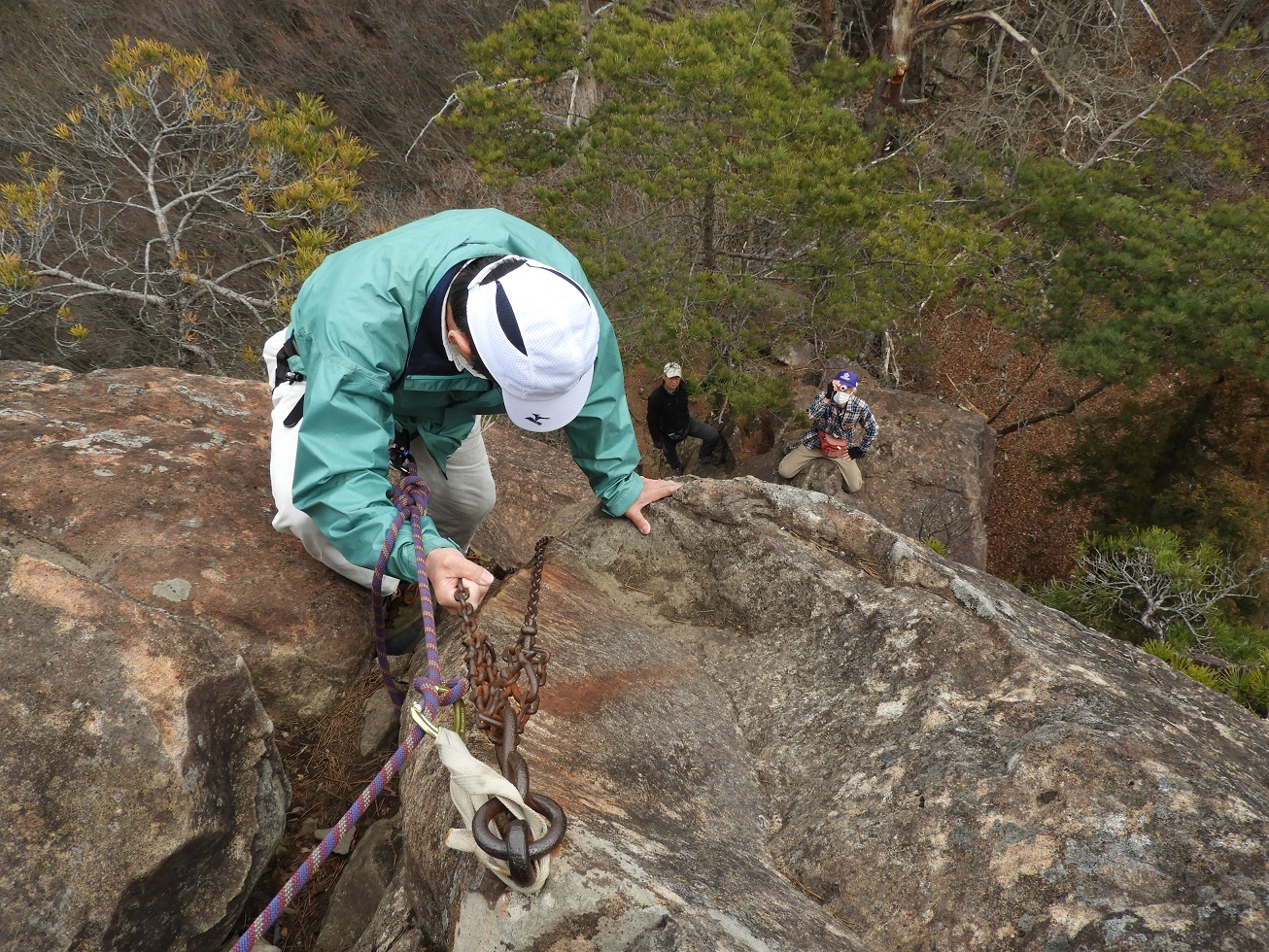 小天狗の隣の不動岩へ。 リーダーが安全確保のロープセットへ。
