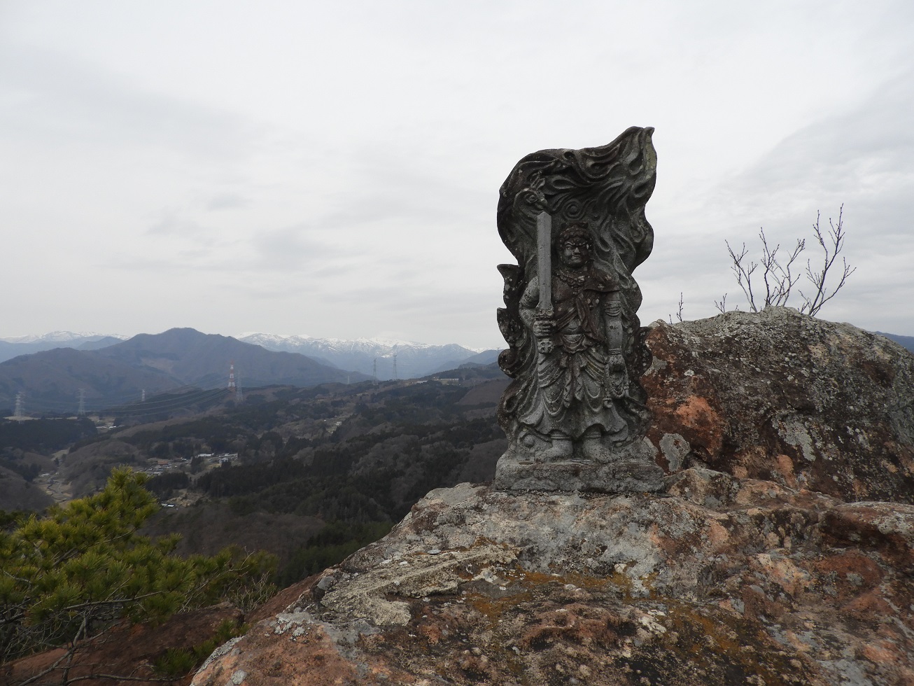 古代から祖先の霊魂を祀る山を「たけやま」と呼び、嵩山は死者の霊が山の上に集まる神聖な「霊山」として、我妻の各地から信仰を集めていたそうである。