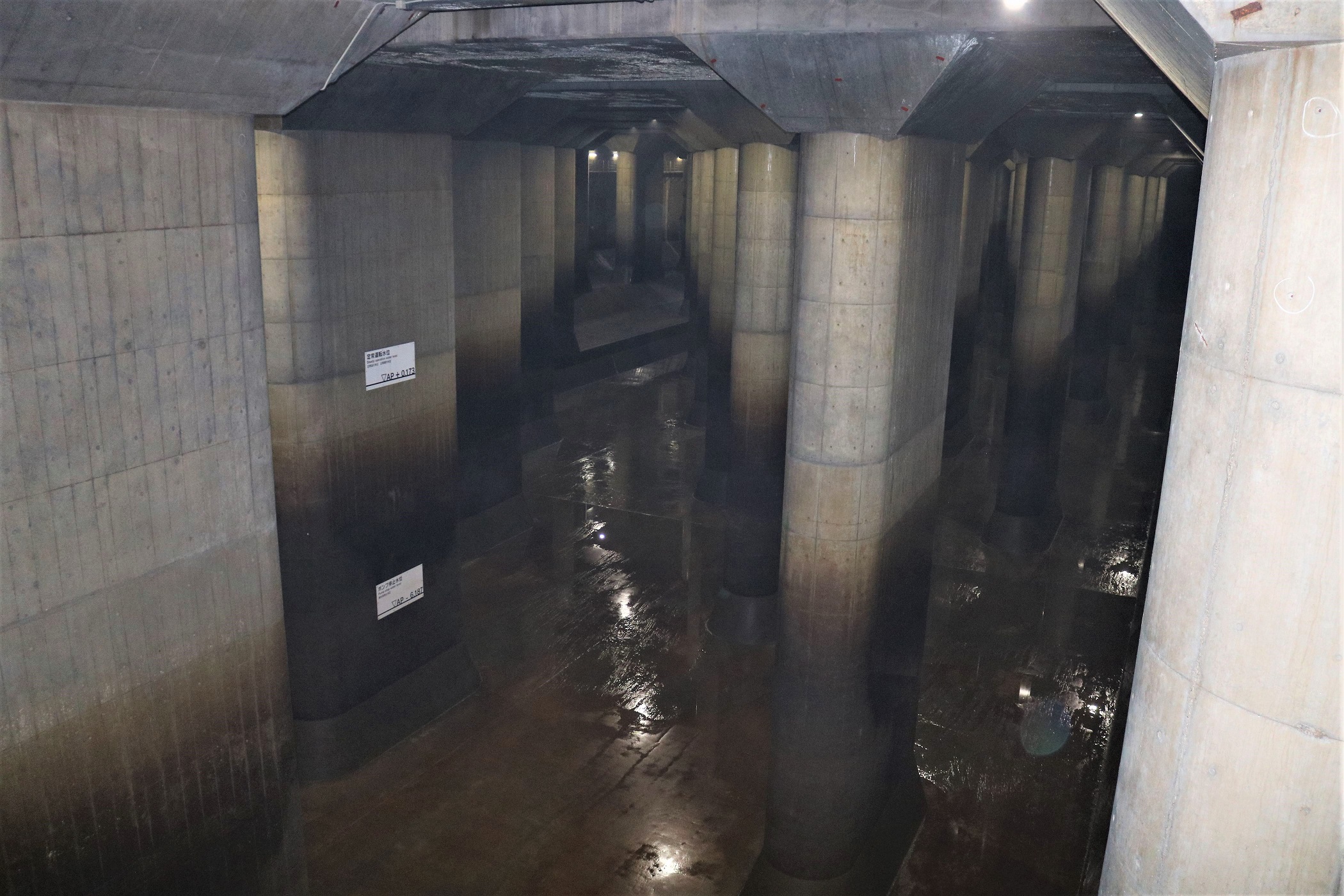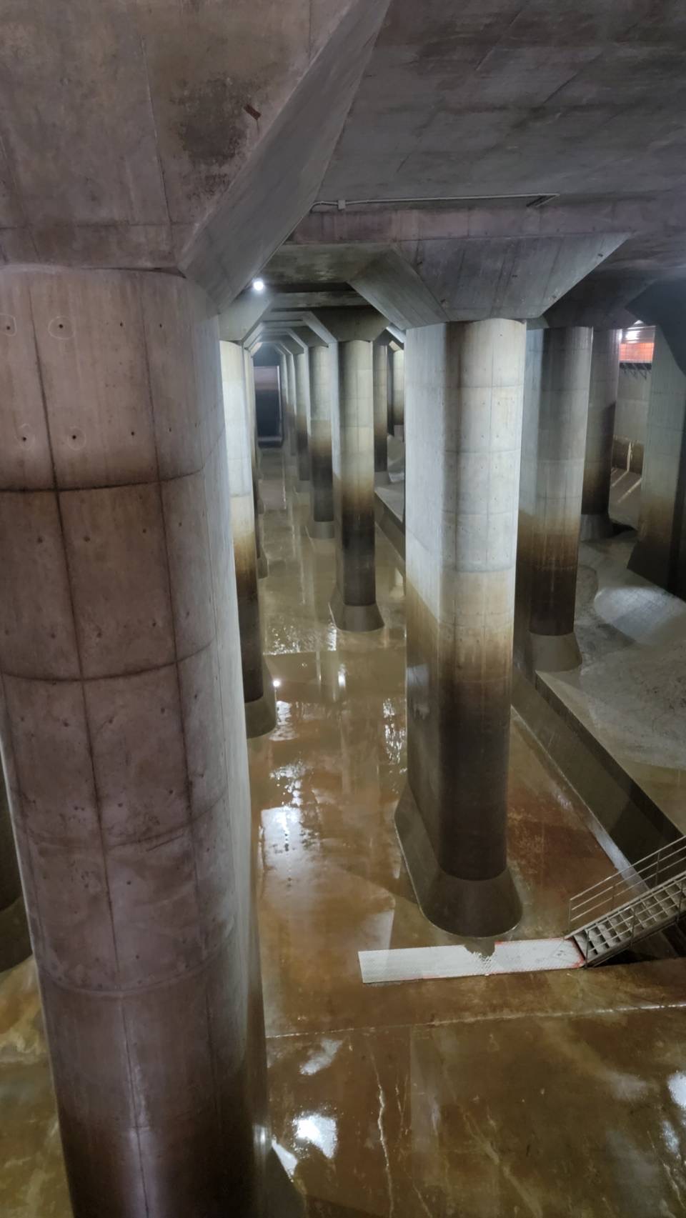 首都圏外郭放水路は埼玉県春日部市にあり、洪水を防ぐ建設された、地底50mを流れる世界最大級の地下放水路です。