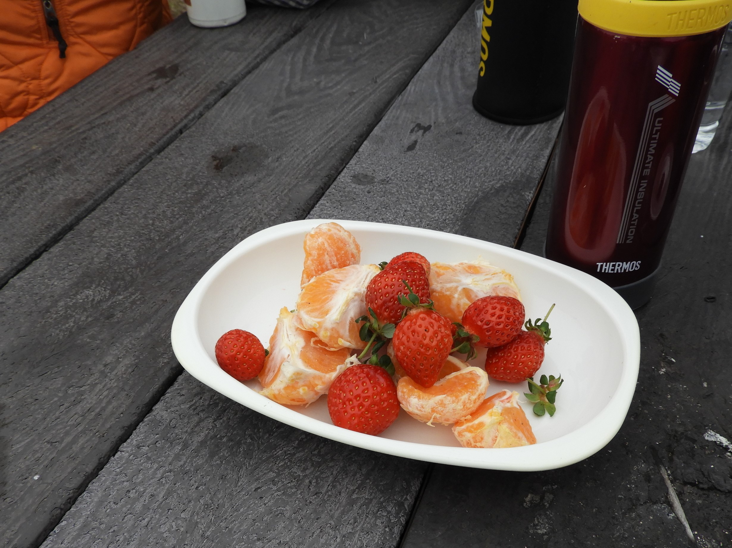 山頂は風が超冷たい。 早くコーヒーにしましょ。 Suzuki's畑の美味しそうなイチゴもあるわ。