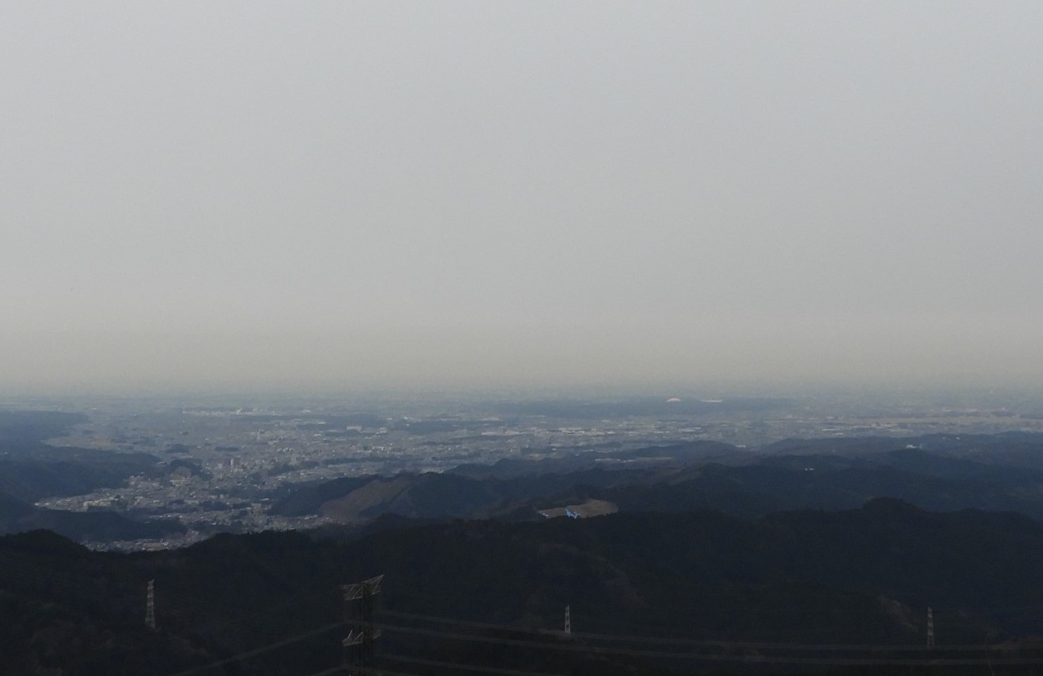 眼下に青梅の街。 霞んでいます。 白いものも舞ってきました。
