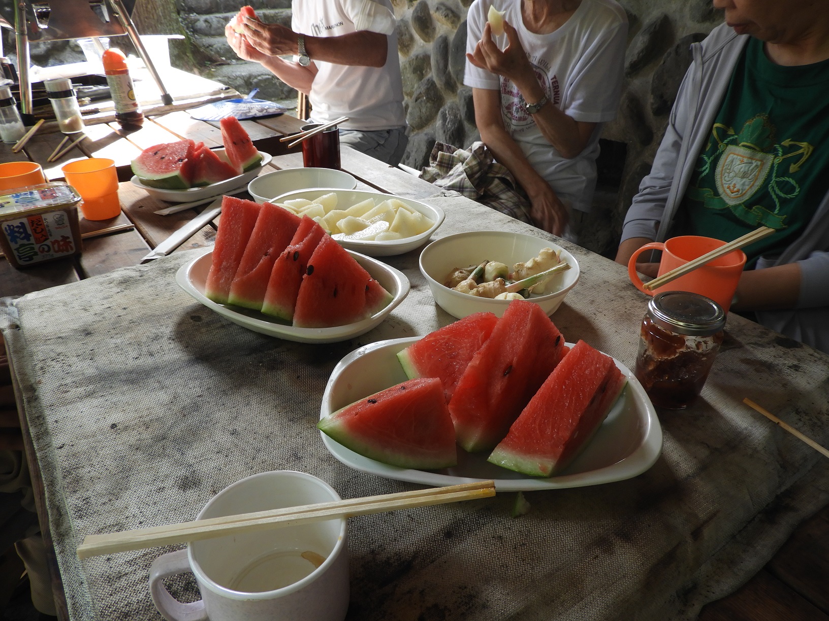 おいしい肉、持ち寄って下さったBBQ用の野菜、トマト、スイカ、梨、パン、・・盛りだくさんでお腹いっぱい。