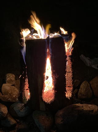 そのあとは恒例のキャンプファイヤー。比企自然学校手造りの「きこりのろうそく(スウェーデントーチ)」で焚火です。幻想的な炎を見ながら皆で合唱したり・・・。