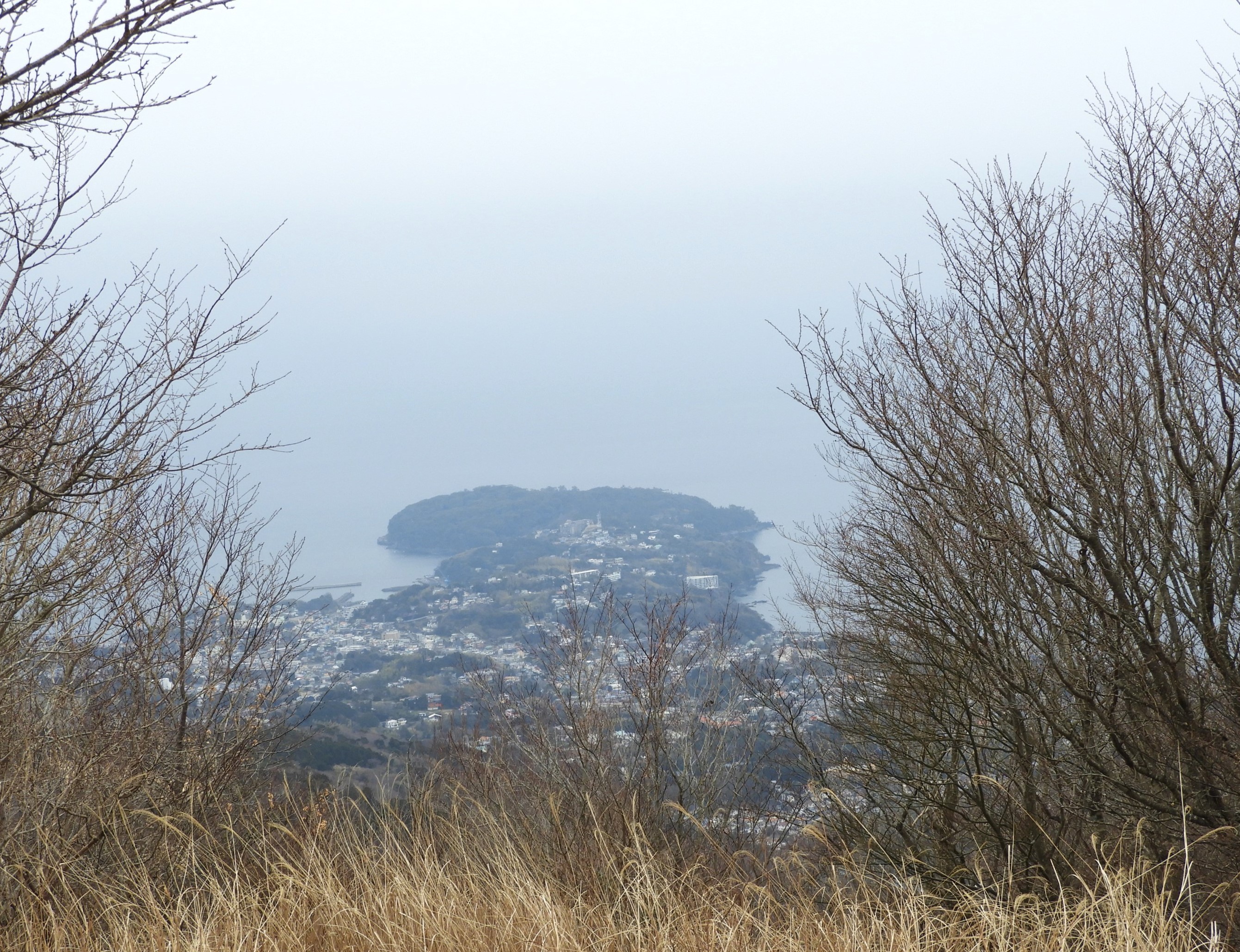 山頂からは眼下に真鶴半島も望められ、無事下山できた。雨も本降りになってきた。