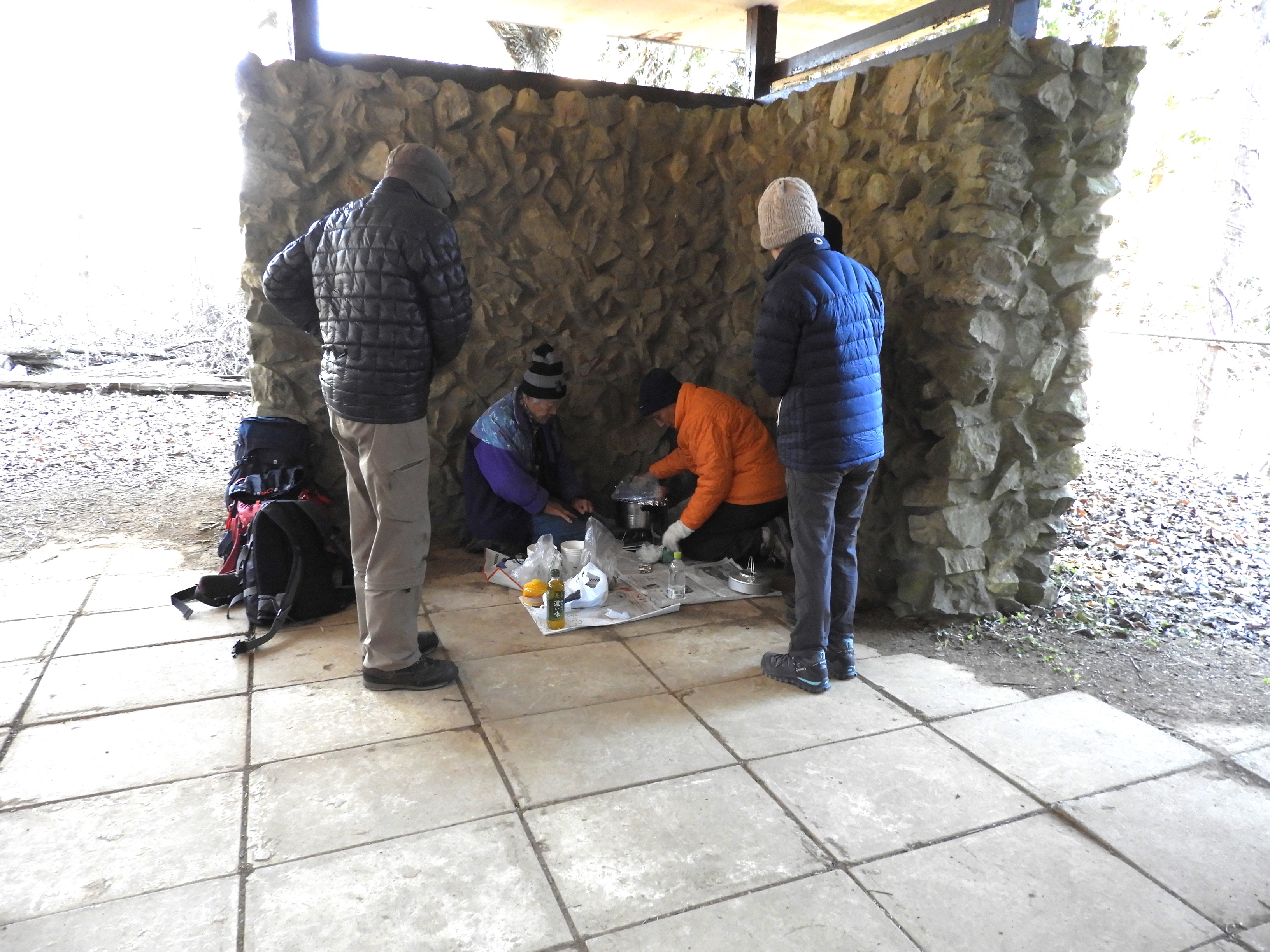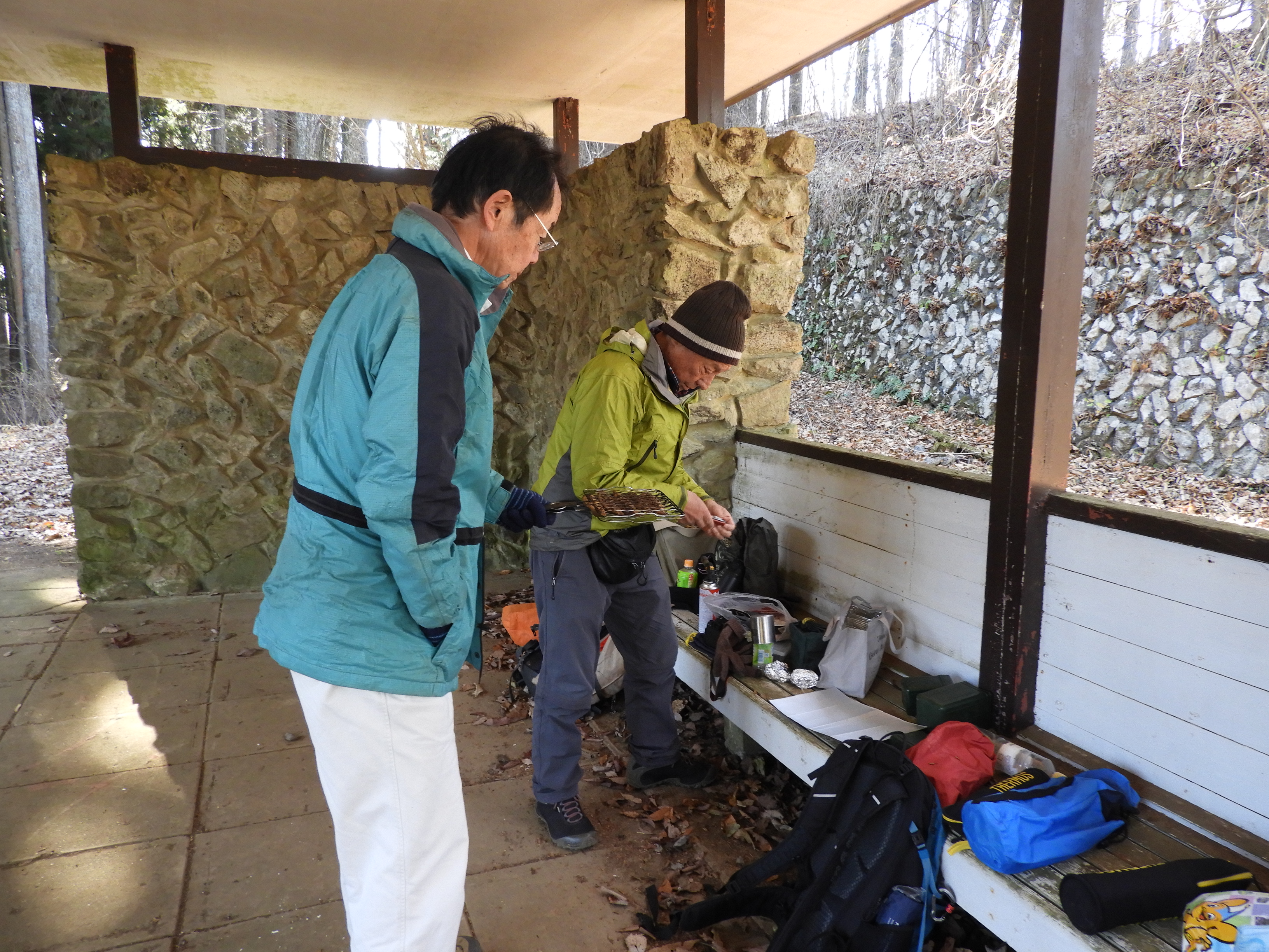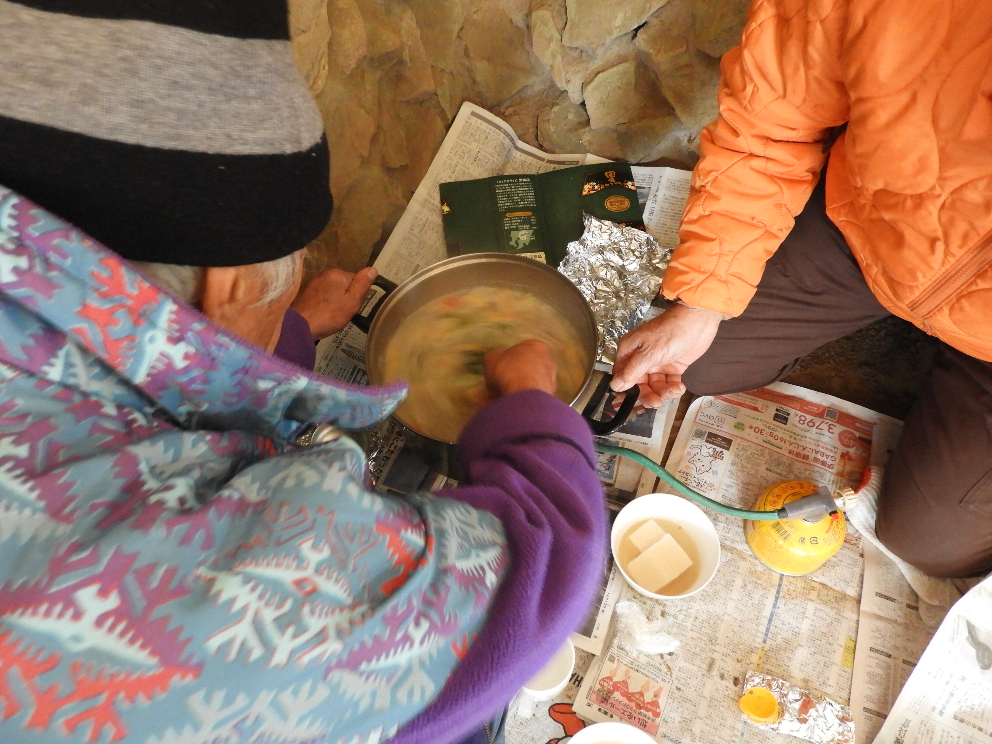 寒波襲来の週末、山頂は北風が吹き荒れ枯れ葉が舞い落ち、コンディションは最悪だったが、いつもの鍋奉行が