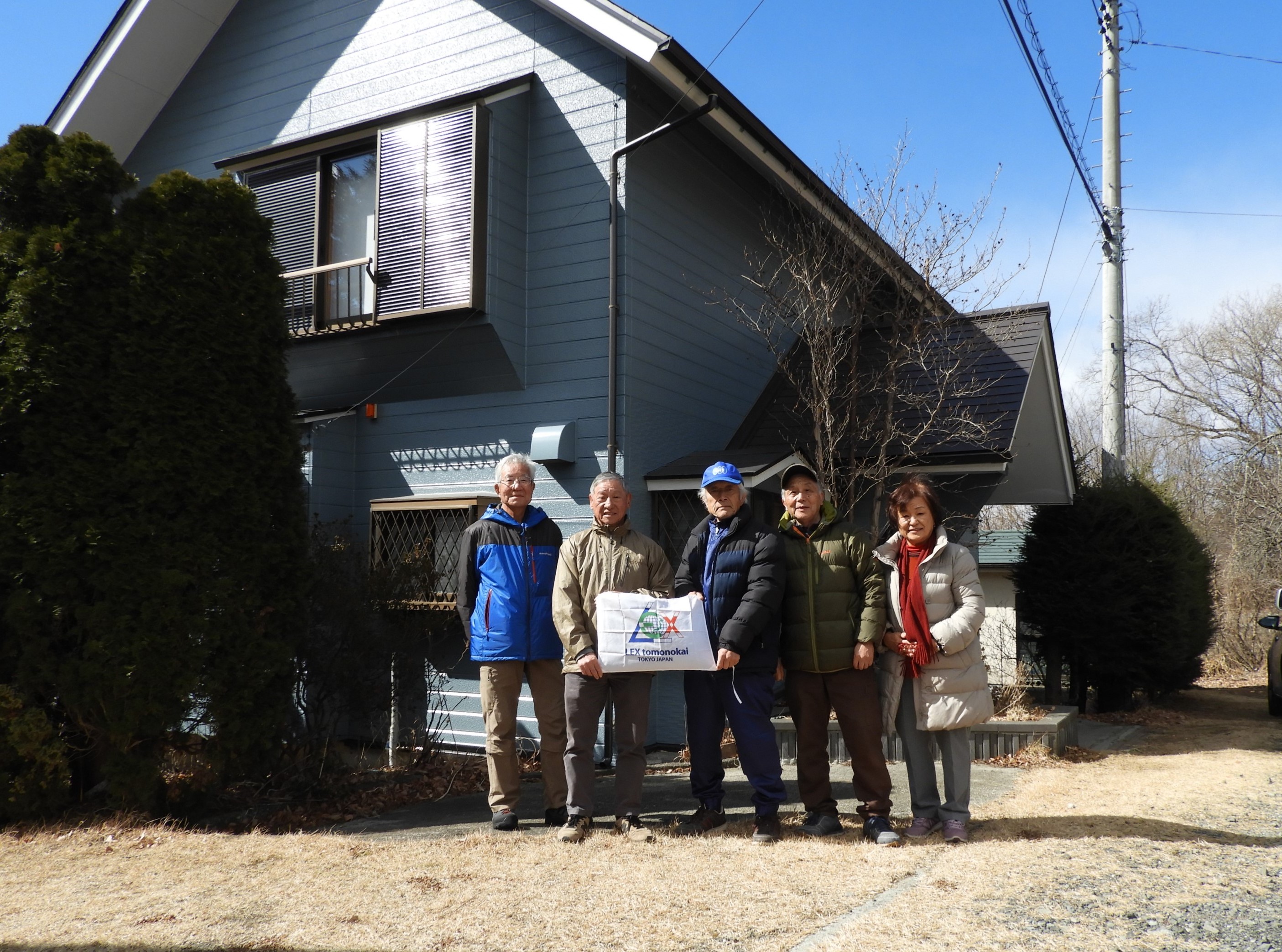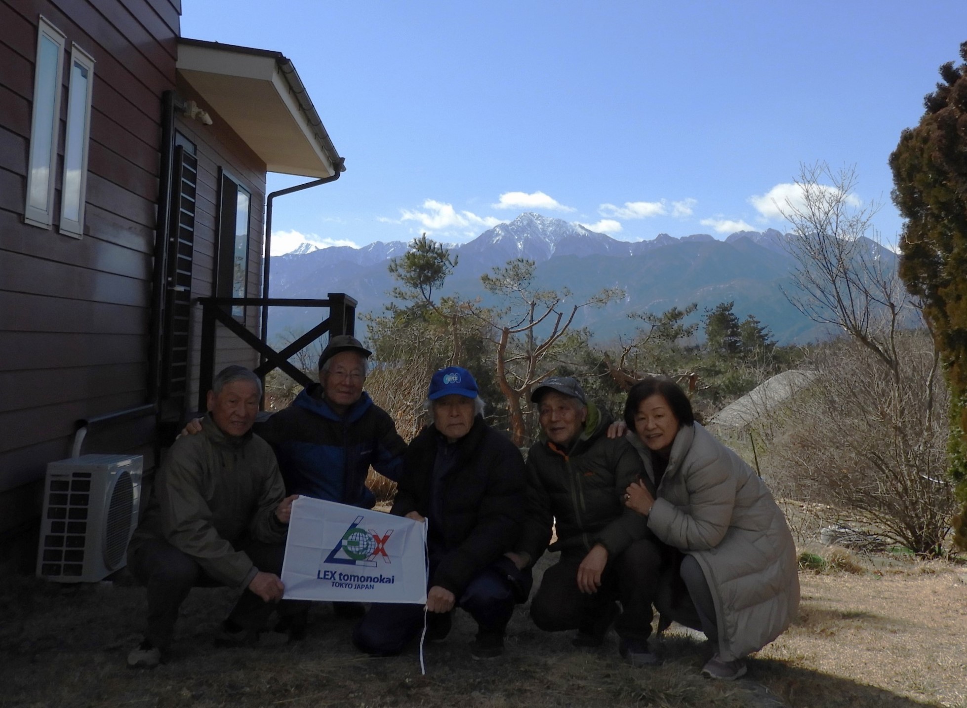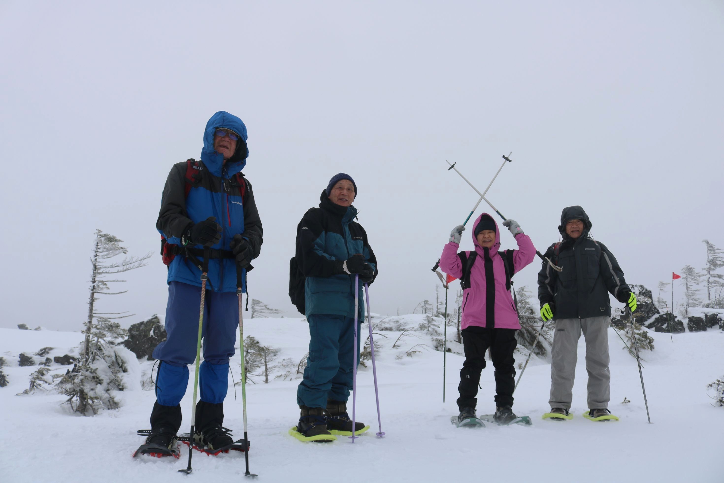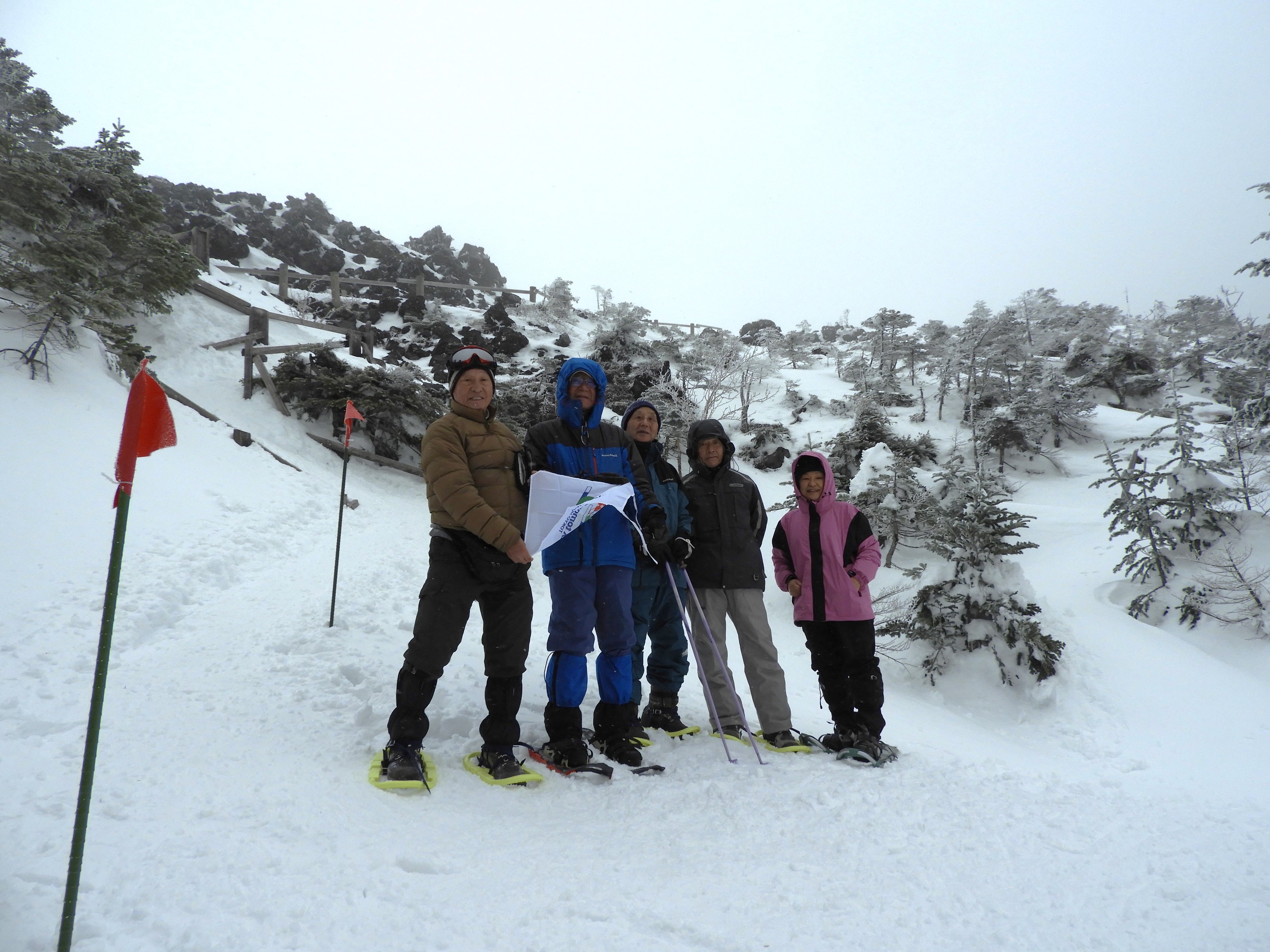 温かいお汁粉を期待していたのだが、とても無理。多少風の弱い所で集合写真を撮るのが精一杯だった。