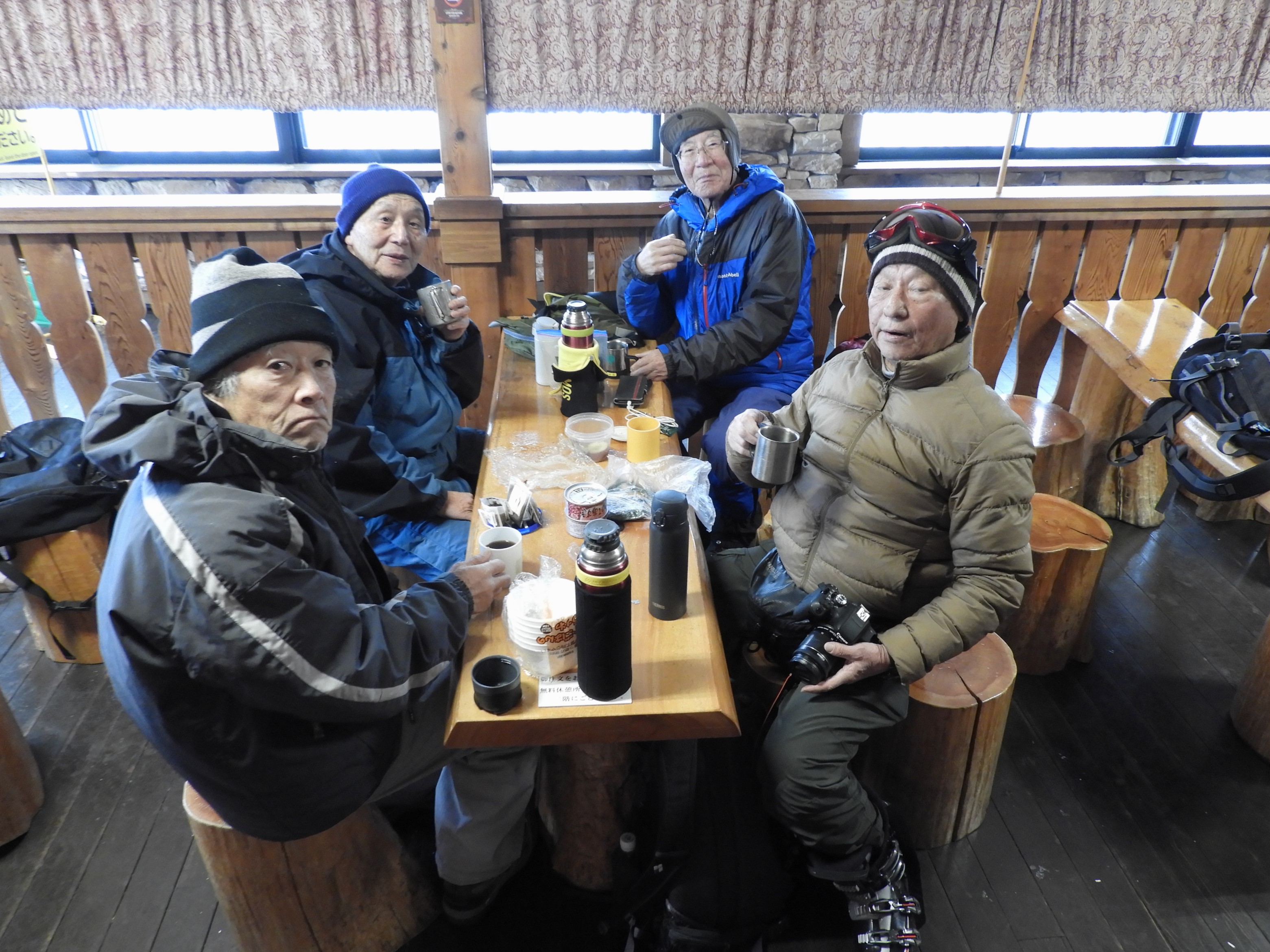 休憩室で持参のコーヒーで暖を取る