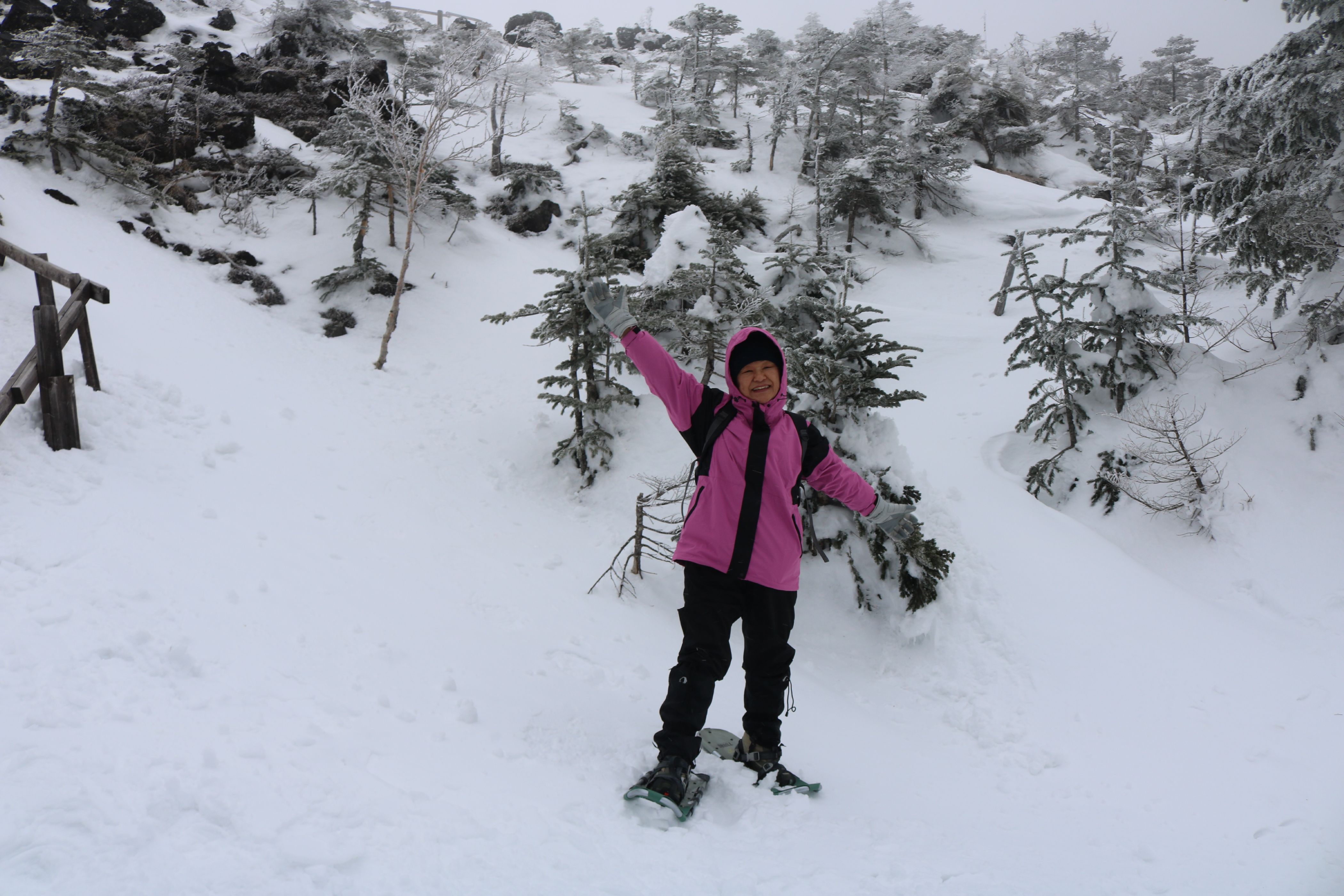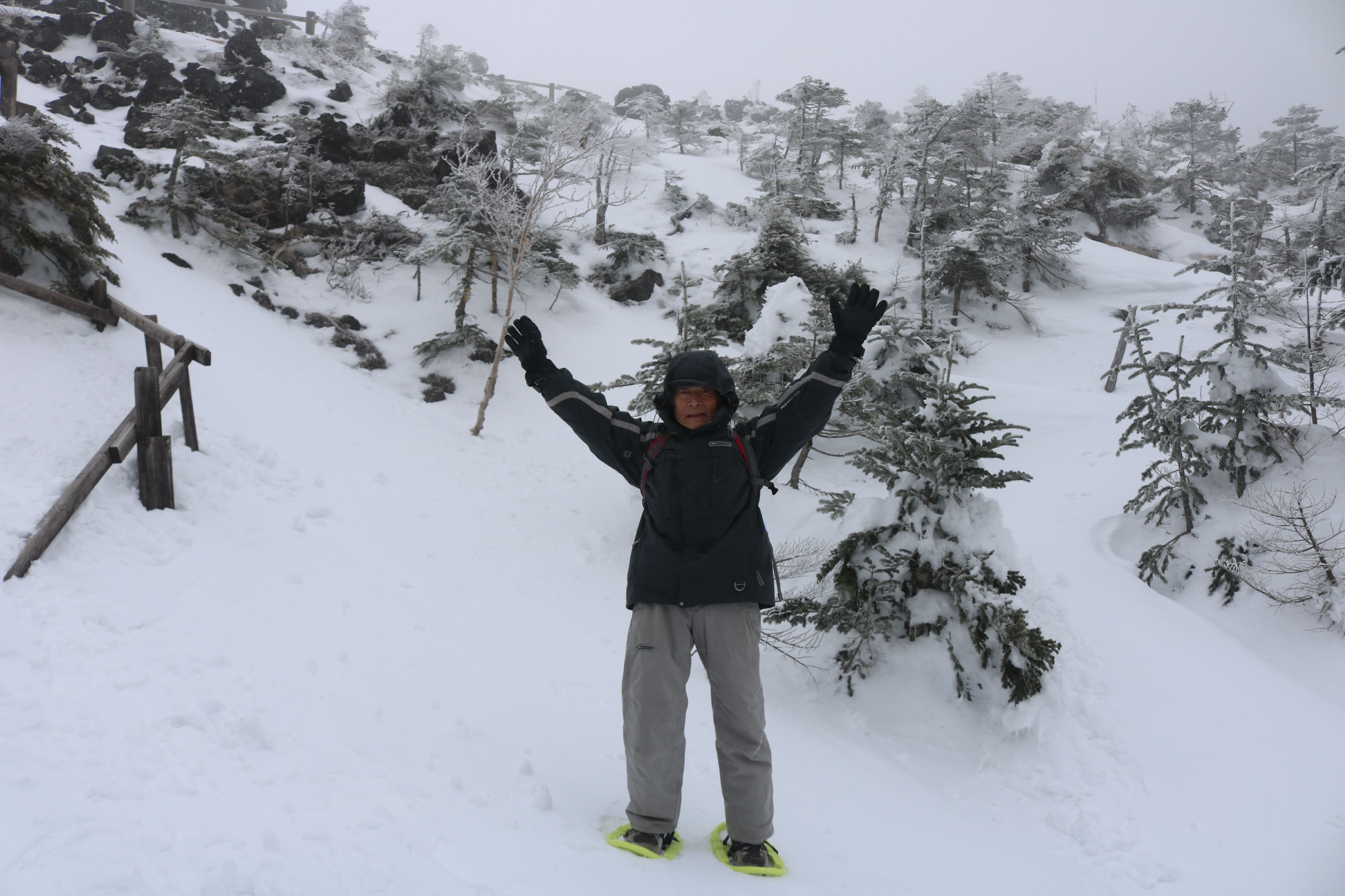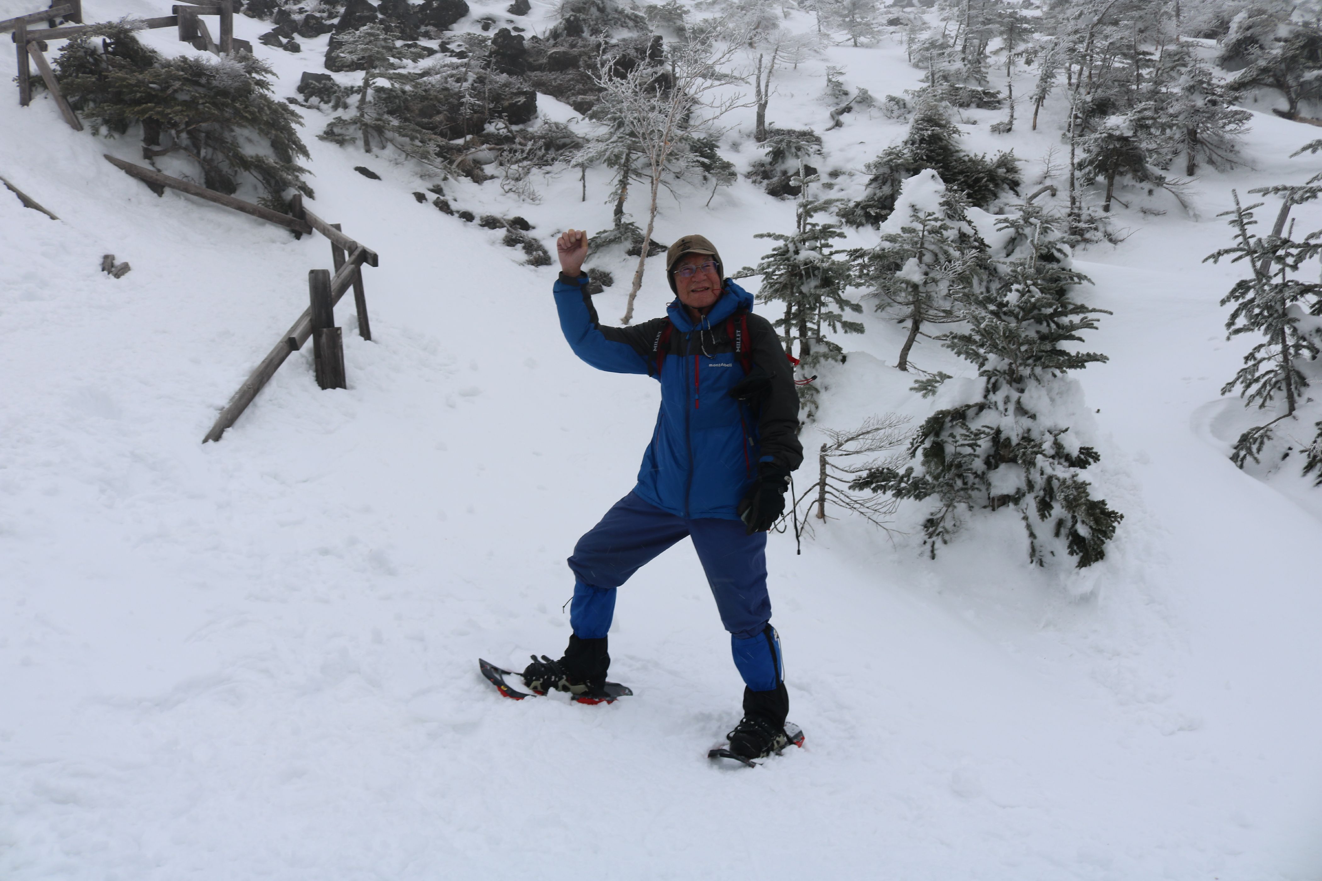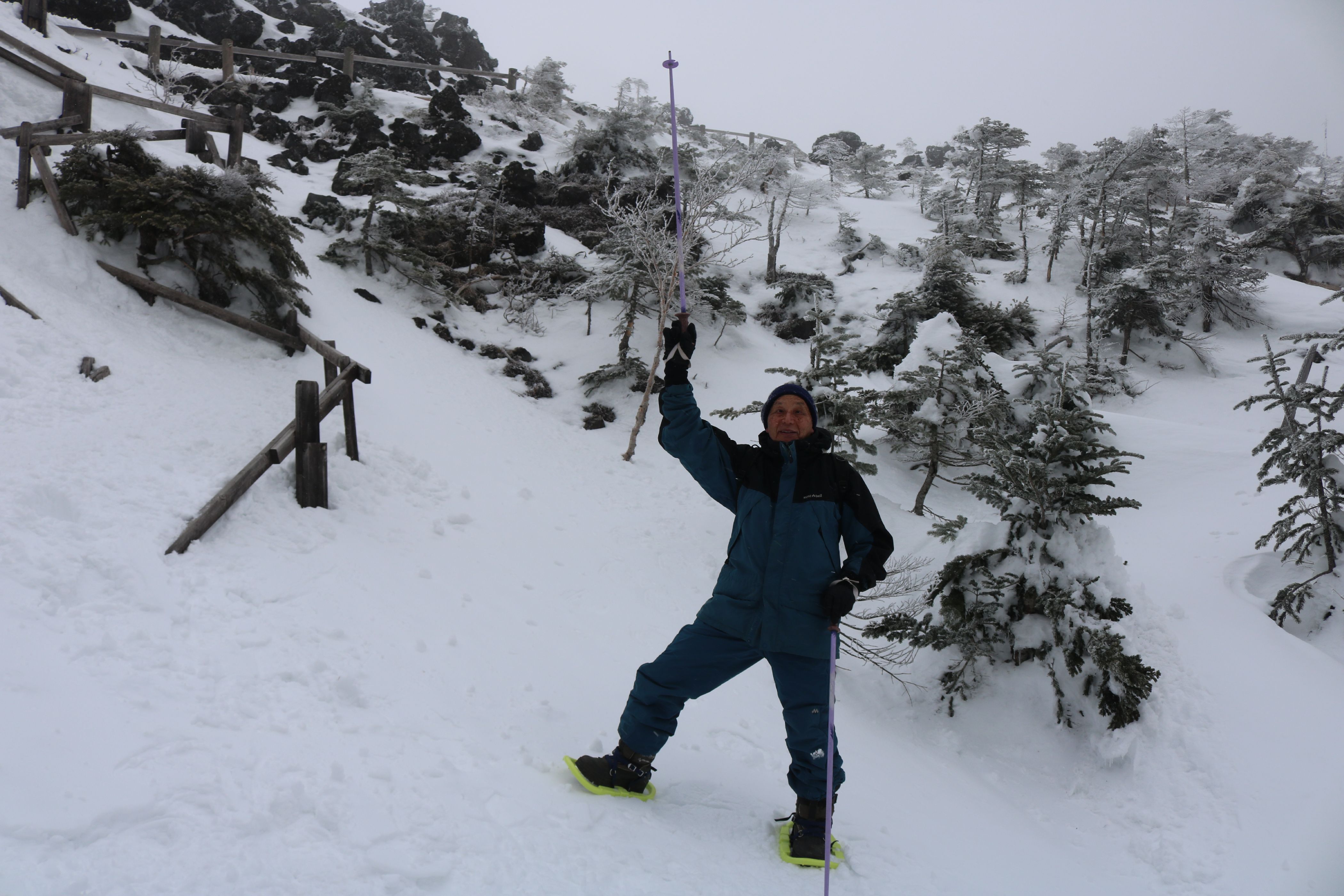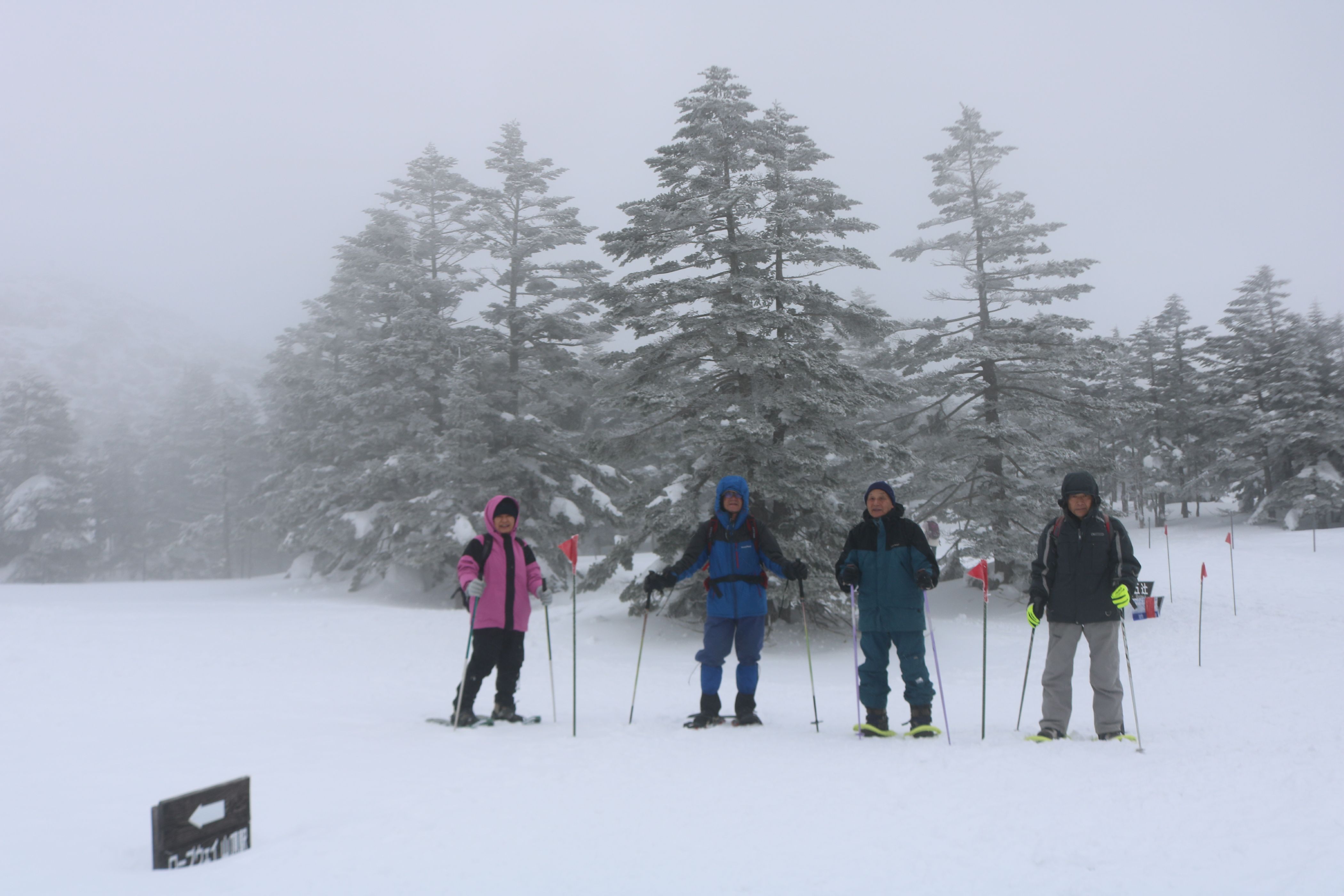 山頂駅に降り立ったら、ものすごい強風と横殴りの雪で視界が悪い。 スノーシューの一番短いコース、2kmほどのシラビソの森周遊コースを歩いた。