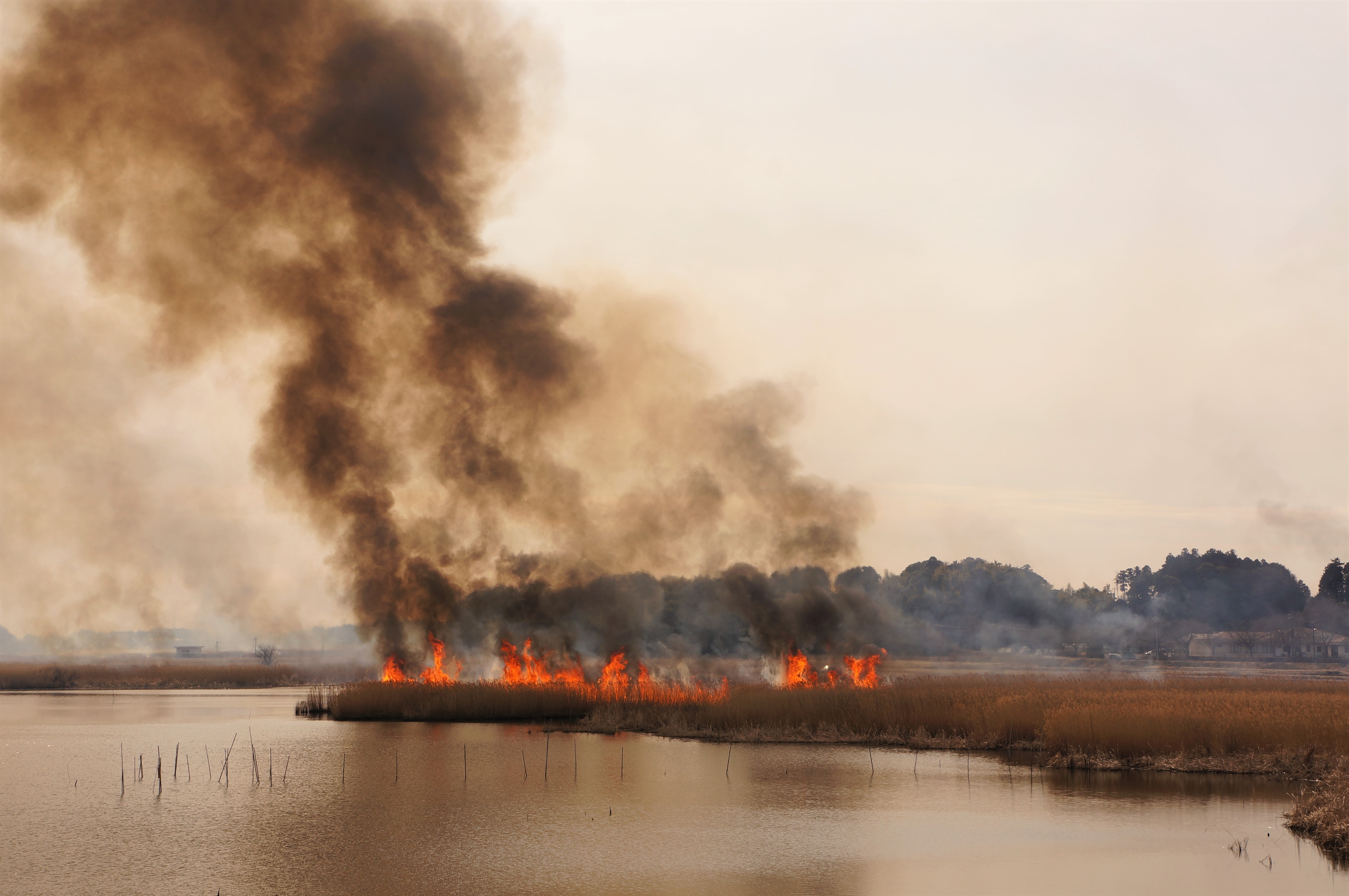 「もうすぐ春です。 谷田川河川敷の野焼きの風景