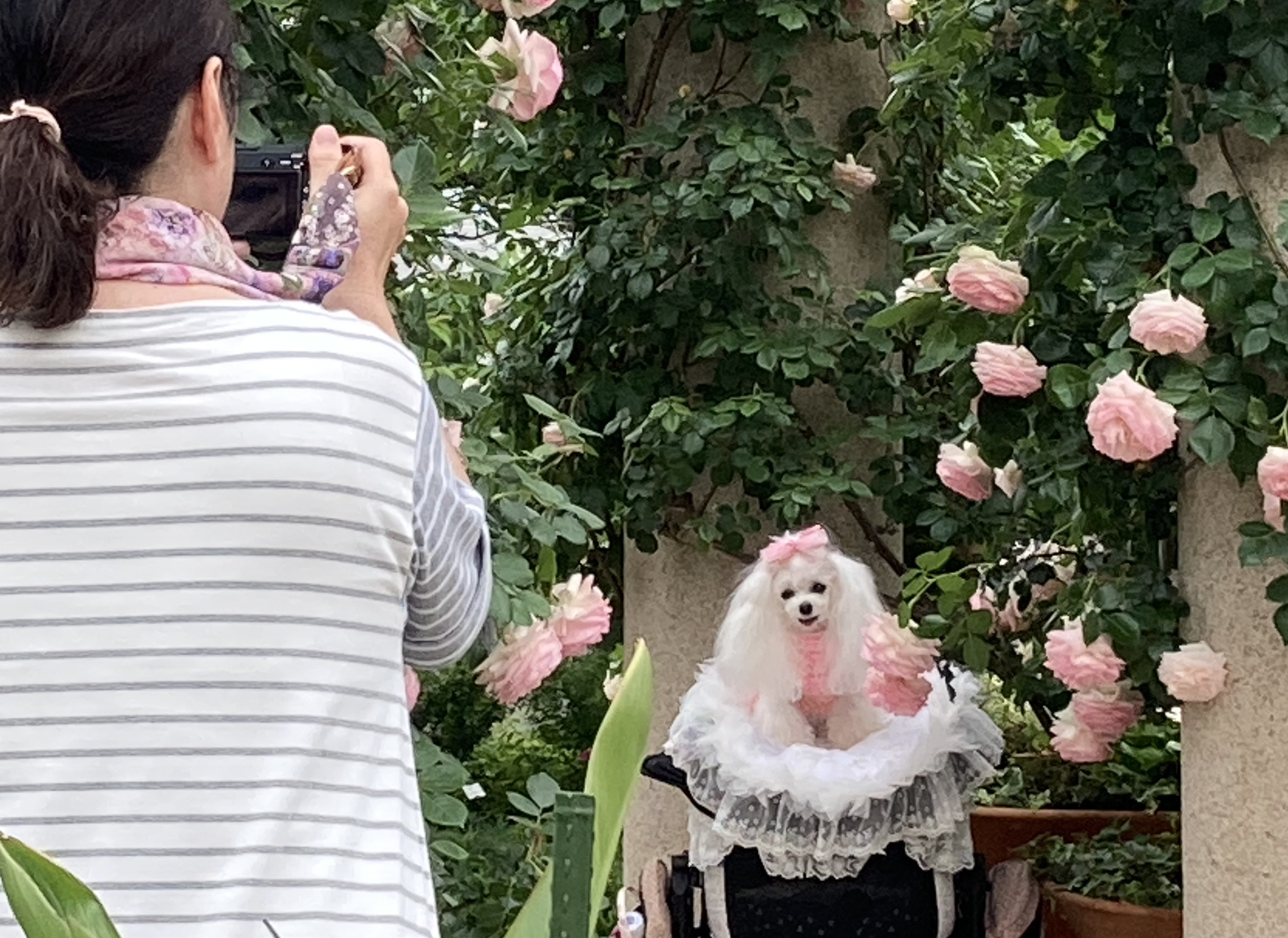 着飾ったワンちゃんに飼い主さんは必死です。 港の見える丘公園バラ Kimura